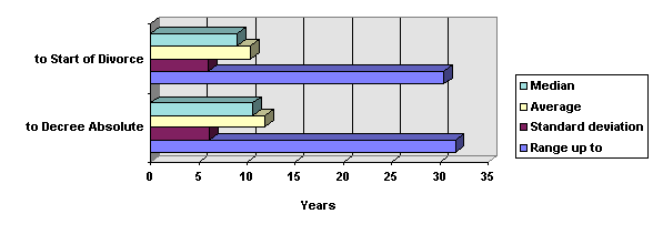 "The median duration of the marriages was about 10 years, and the respondents had a median age of 38 years of age at the start of divorce. The average number of children was close to 2, and their median age was over 6. The respondents occupations could be described as middle-class, although there was a great range of different occupations."