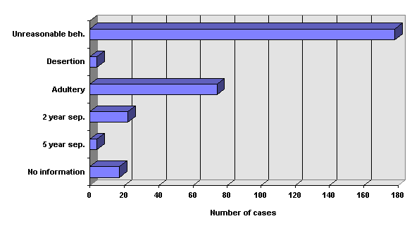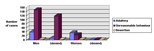 "The vast majority did not want their family to split up. None wanted to be separated from their children. Men were in most (over 70%) cases divorced by their wives, against their wishes. The grounds were predominantly unreasonable behaviour (nearly 60%) and adultery (nearly 25%). Most men denied the allegations made, and in those cases in which the man divorced the woman, few women denied the allegations."