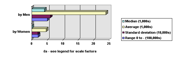 "On average, the man brought 5 times as much asset value into the marriage as the woman. During the marriage, the man on average earned 4 times that which the woman earned. On average the woman obtained, after the divorce, 5 times as much of the family assets as the man. The women, as a group, obtained nearly 80% of the families assets.