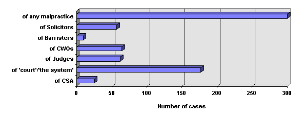 "Almost all respondents reported malpractices in their legal proceedings, with about 20% of these identifying solicitors, about 20% identifying Court Welfare Officers (CWOs), and about 20% identifying judges as responsible. About 50% of CWOs did not meet the fathers with their children, and about 66% of CWO reports were regarded as unfair. The majority of CWO reports, whether fair or not, were accepted by the judge.