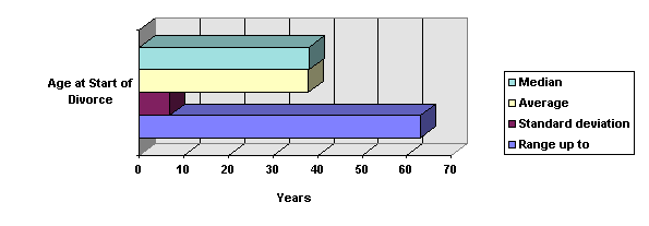 "The median duration of the marriages was about 10 years, and the respondents had a median age of 38 years of age at the start of divorce. The average number of children was close to 2, and their median age was over 6. The respondents occupations could be described as middle-class, although there was a great range of different occupations."