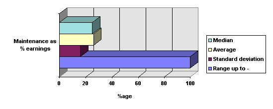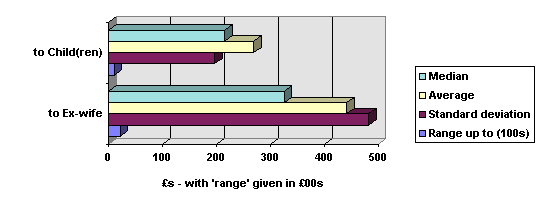 As maintenance is made on an on-going yearly basis, for a number of years, it is possible to provide both yearly and total data. The median and average ages of children at start of divorce proceedings are 6 and 7 years respectively, and maintenance for children is payable until the children are 18 or leave education : a typical length of time over which maintenance is made is therefore about 10 years, and this is therefore used. That is, the totals represent how much will be made over the following 10 year period. The total for all cases is that for those cases arising from divorce in a 1 year period. To provide for this, data is given :