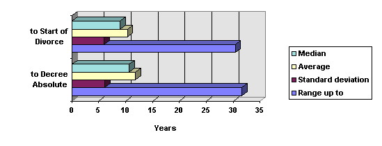 Comments : marriages in the survey were long term commitments, with an average of about 10 years up to about 30 years. The difference in the durations i.e. from start of divorce proceedings to decree absolute also gives data for the time taken to divorce. Based on the median this is 1.63 years, and based on the average this is 1.53 years.