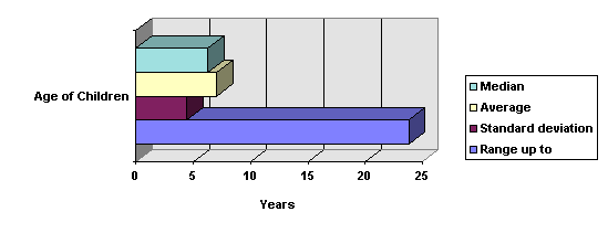 Comments : as the average age was close to 7, with a standard deviation of over 4, it is clear that most ages of children occurred, from babies to teenagers. The popular belief that difficult periods are after the birth of children, and after children have left home, are not supported by these results.