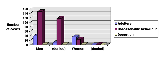 Comments : approximately 3 times as many women petitioned for divorce as men. The unreasonable behaviour grounds were used in more than two-thirds of cases. Most men denied the allegations, although few women denied them, as reported by the man responding. An interpretation of the data for grounds and denial is that it was unnecessary for women to deny, while men found it necessary in order to defend themselves.